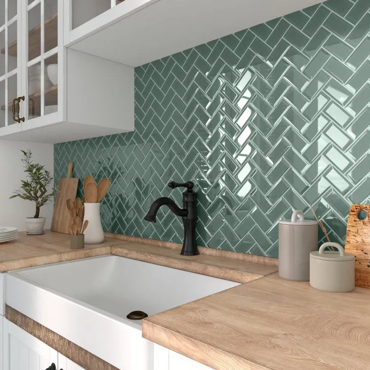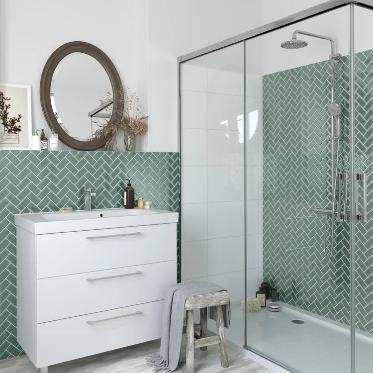 Disposé en chevrons, ce carrelage mosaïque métro de couleur verte finition brillante allie originalité et sobriété pour habiller toutes les pièces du logement. Réservé à un usage mural intérieur, sa qualité permet en effet de profiter de son style sur les crédences de cuisine, les murs de douches ou ceux des espaces de vie comme le salon ou la salle à manger. Utilisable en frise ou sur un pan de mur entier, sa pose est accessible à tous et nécessite l’utilisation de croisillons en T. Cette mosaïque murale s’entretient simplement avec une éponge non abrasive et un produit ménager doux.