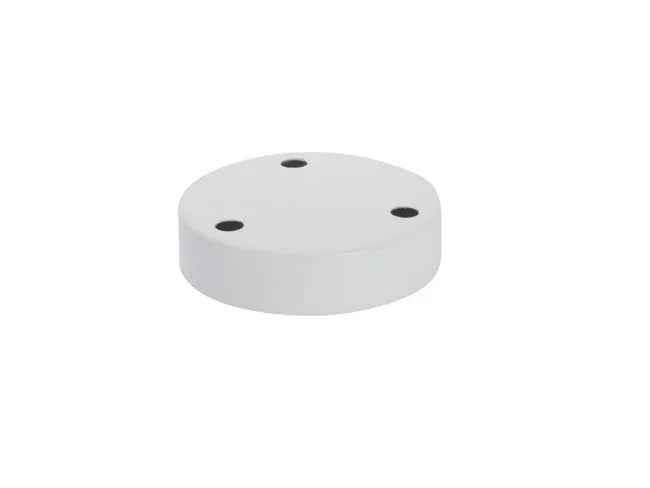 Rosace métallique en métal blanc, adaptée au maintien de douilles de type E27. Il est installé avec des vis. Dimensions : 120 x 115 x 25 mm (largeur x longueur x profondeur).